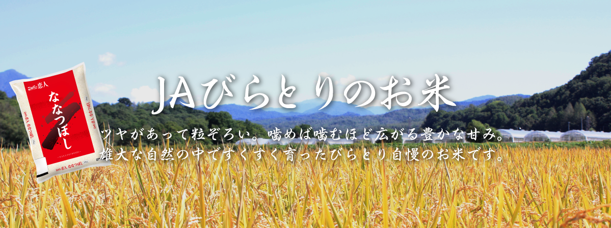 JAびらとりの生産者の方々の大きな愛情に包まれて、のびのびと育った真っ赤なトマト。 びらとり和牛は北海道の豊かな大自然の中で育てられた新鮮で高級な黒毛和牛です。 陽をいっぱい浴びてすくすく育ったお米は、おいしさが光ります。